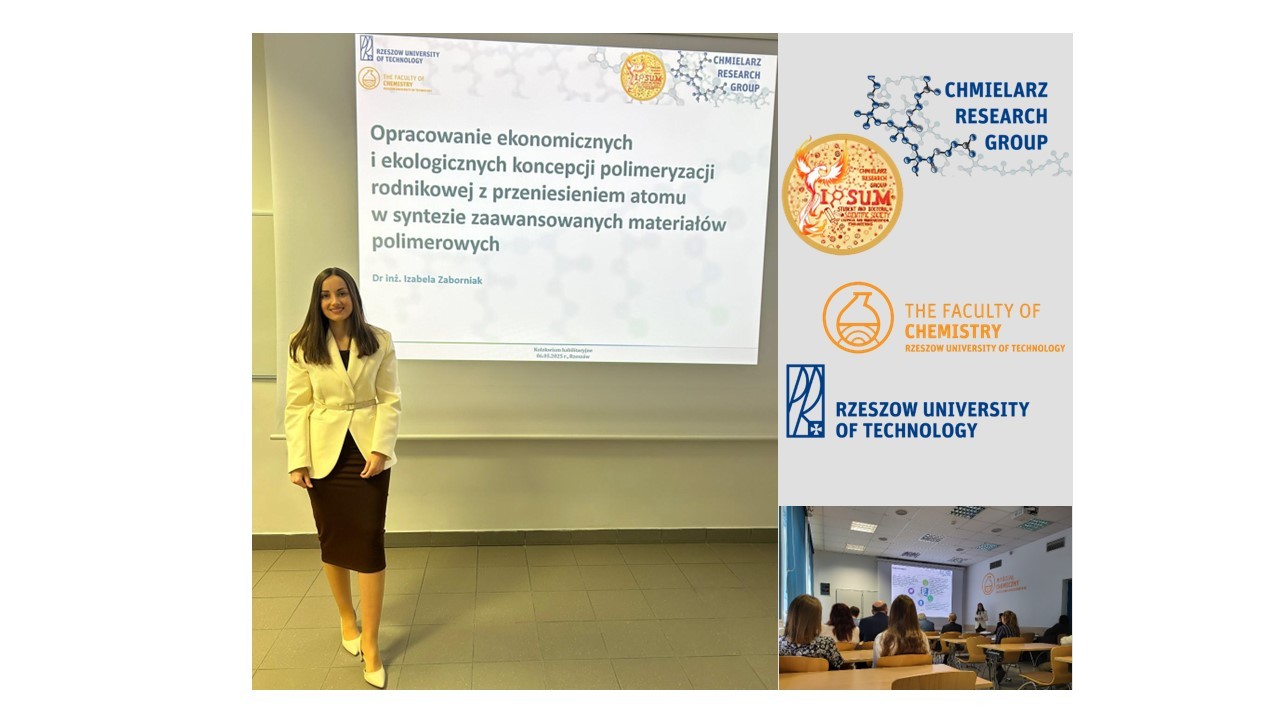 Dr inż. Izabeli Zaborniak dnia 6 maja wygłosiła kolokwium habilitacyjne podsumowujące monotematyczny cykl artykułów pt. "Opracowanie ekonomicznych i ekologicznych koncepcji polimeryzacji rodnikowej z przeniesieniem atomu w syntezie zaawansowanych materiałów polimerowych".