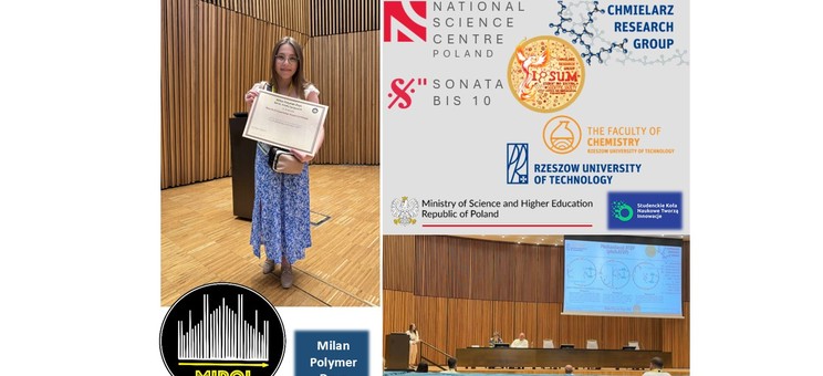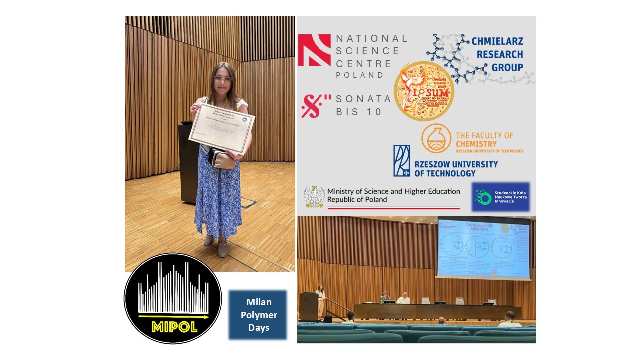 Miło nam poinformować, że mgr inż. Małgorzata Klamut, doktorantka III roku w Szkole Doktorskiej Politechniki Rzeszowskiej im. Ignacego Łukasiewicza oraz członkini grupy badawczej Chmielarz Research Group, a także Studenckiego i Doktoranckiego Koła Naukowego Inżynierii Chemicznej i Farmaceutycznej "IPSUM" na międzynarodowej konferencji Milan Polymer Days (MIPOL2025), organizowanej w Mediolanie, w dniach 18-20.06.2025, otrzymała nagrodę za najlepszą prezentację ustną, podczas sesji młodych naukowców.
